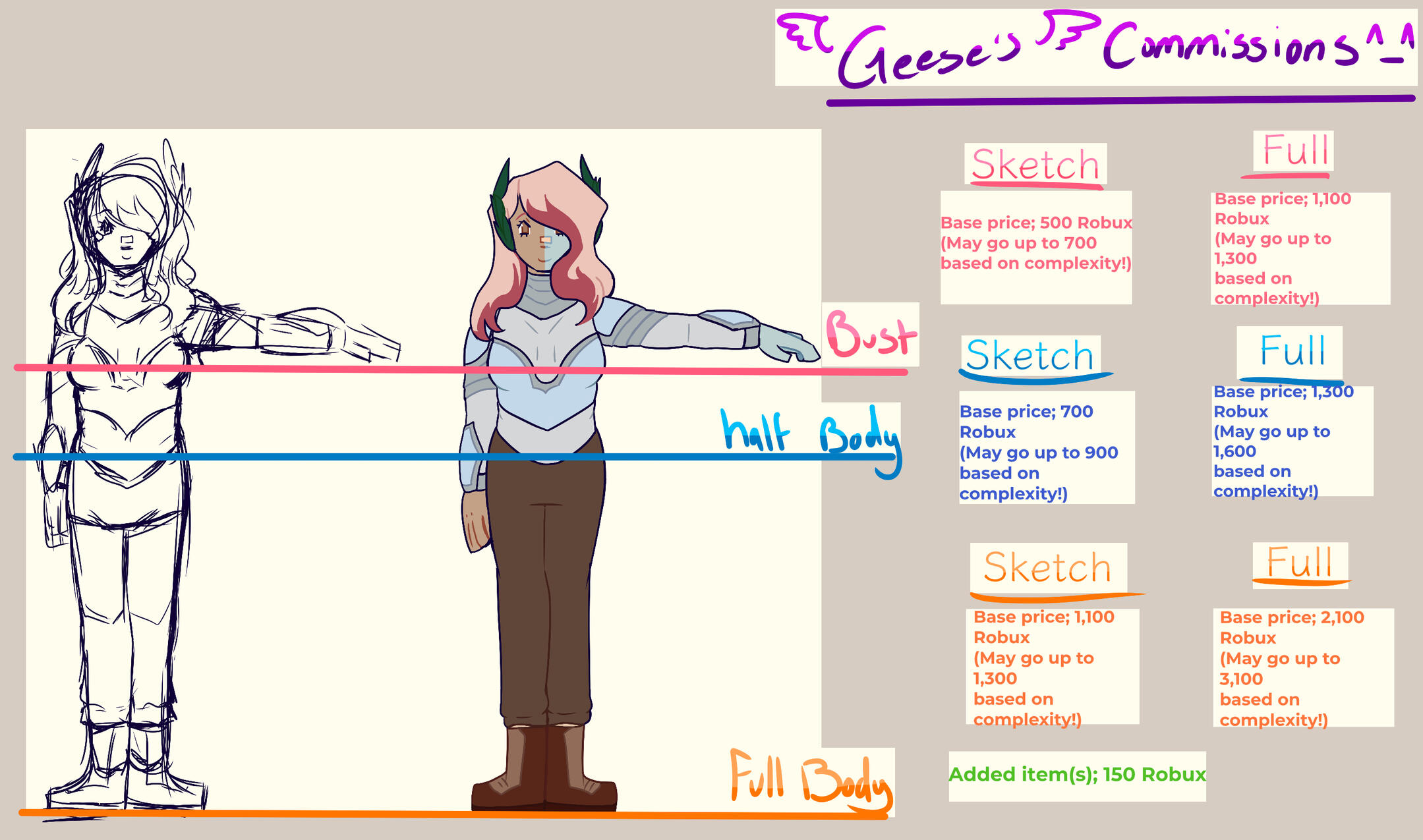 However; if the client wishes for it to be colored, it will be an added 150! (fee applies to bust/half/full)